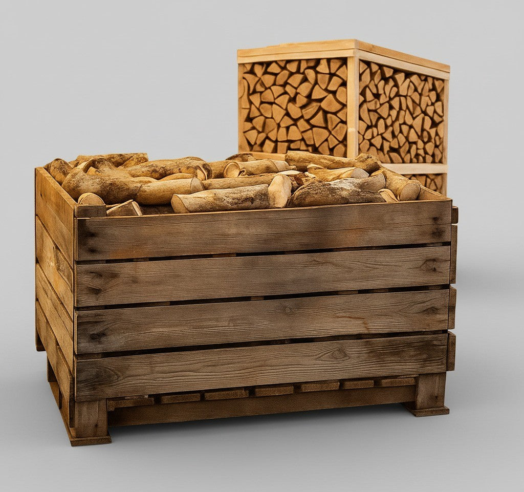 OBS: Trækasserne genbruges og kan have mindre skader. Anbefales at om stables efter levering, da kassernes store overflade ikke egner sig til udendørs opbevaring over længere tid. Træet kan have enkelte spor efter borebiller, men det påvirker ikke brændets kvalitet.