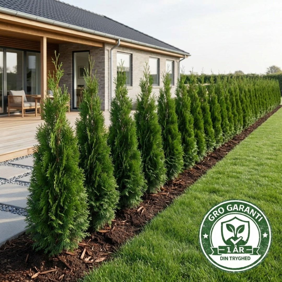 Thuja ‘Smaragd’ Thuja occidentalis ‘Smaragd’ er en eksklusiv og tæt hækplante med en smal, opret vækst og en smuk, dybgrøn farve året rundt. Den vokser mere moderat end Brabant, holder sin naturligt slanke form og kræver minimal beskæring. Meget velegnet til danske forhold og perfekt til både mindre haver og repræsentative anlæg, hvor et elegant og ensartet udtryk ønskes.